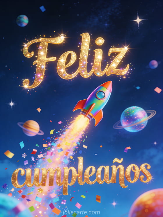 Comparte una tarjeta enérgica de cumpleaños con un cohete colorido despegando en un cielo nocturno profundo, dejando una estela de confeti y brillo entre planetas y estrellas. Descubre también una feliz cumpleaños niño gif, una feliz cumpleaños mi hijo amado o un mensaje feliz cumpleaños hijo.