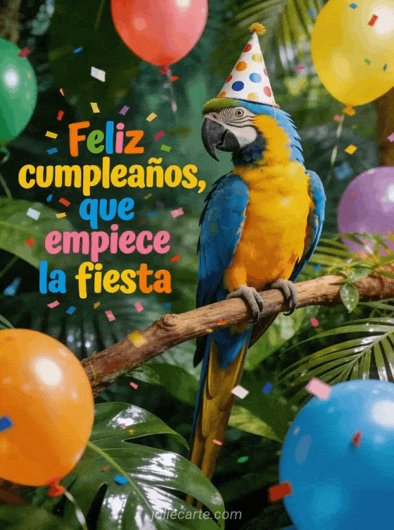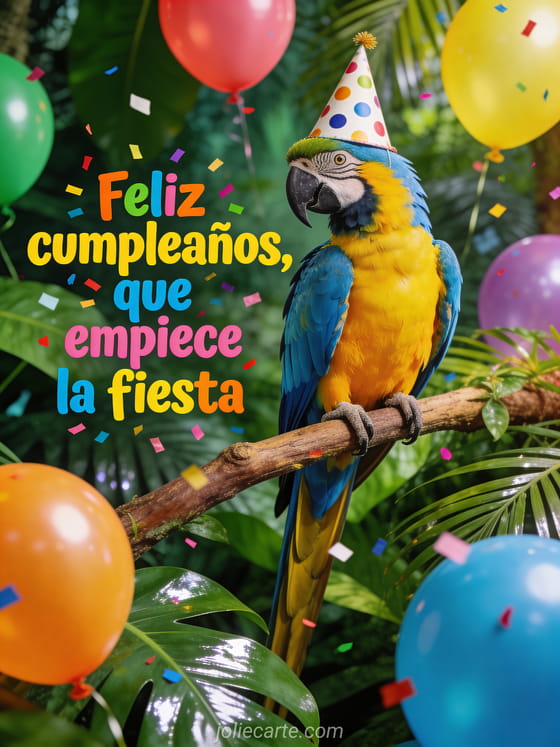 Esta divertida tarjeta de cumpleaños para hombres muestra un loro ara azul y amarillo posado en una rama tropical, con un sombrero de fiesta de lunares, rodeado de globos coloridos en una exuberante jungla. La tarjeta perfecta para hacer reír a cualquier hombre en su día especial. Descubre también una bonita tarjeta de cumpleaños para hombre gratis o una tarjeta de cumpleaños para hombre gratis.