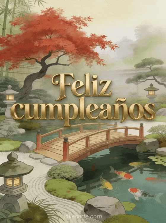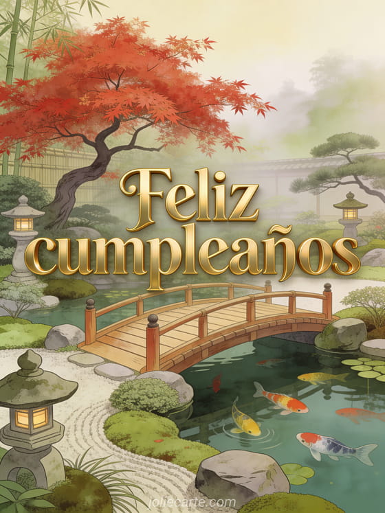Envía una elegante tarjeta de cumpleaños con un jardín japonés con un arce rojo ardiente, un puente de madera sobre un estanque con carpas koi y linternas de piedra. Descubre también imágenes feliz cumpleaños hombre humor o hombre feliz cumpleaños.
