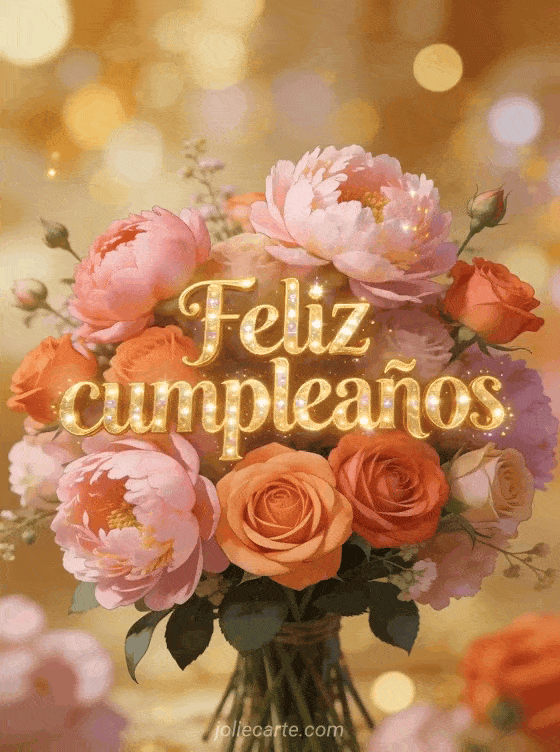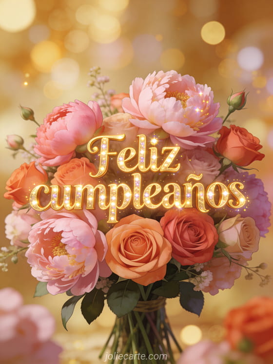 Comparte esta imagen de feliz cumpleaños llena de flores y luz dorada. Descubre también una tarjeta palabras de feliz cumpleaños o una tarjeta te deseo un feliz cumpleaños lleno de felicidad.