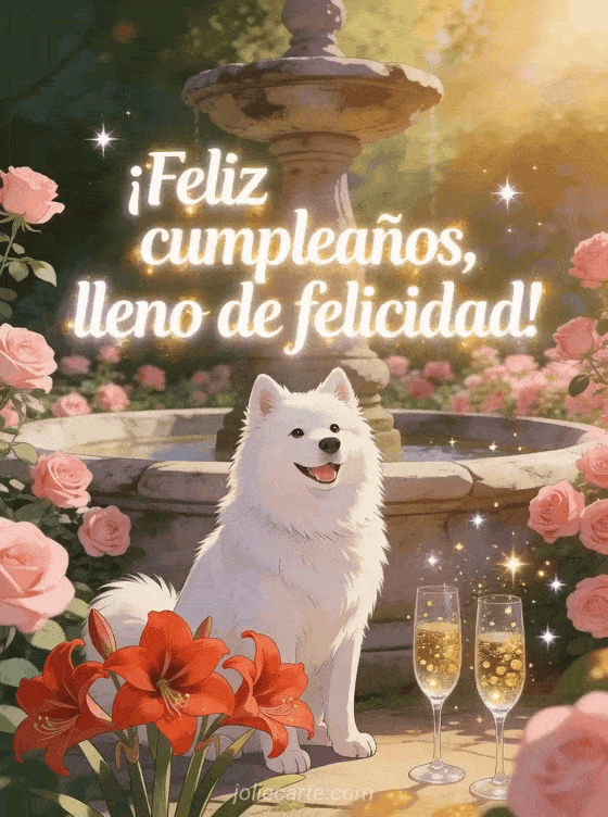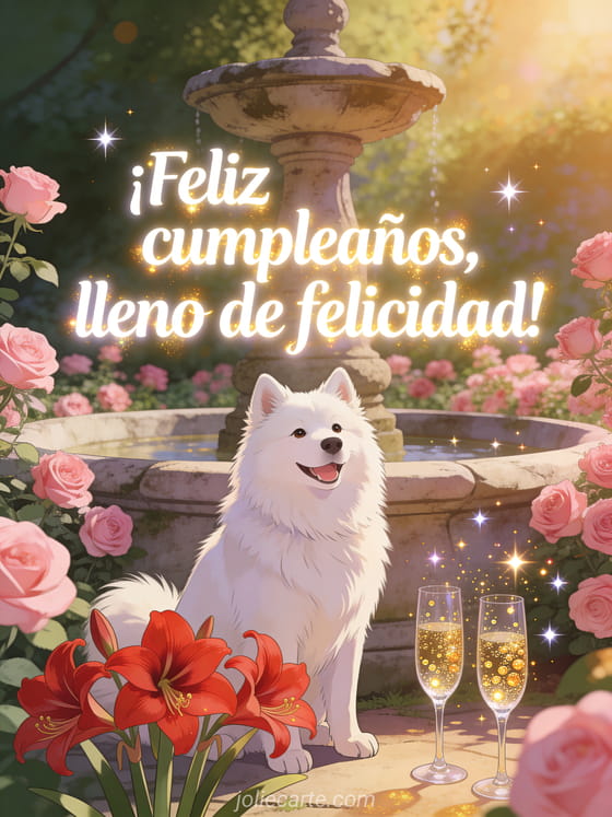 Celebren con una tarjeta radiante de cumpleaños con samoyedo blanco sonriente, fuente antigua, rosas frescas, amarilis rojos y copas de champán con brillo. También pueden descubrir te deseamos un feliz cumpleaños, feliz cumpleaños gato tierno y feliz cumpleaños musical.