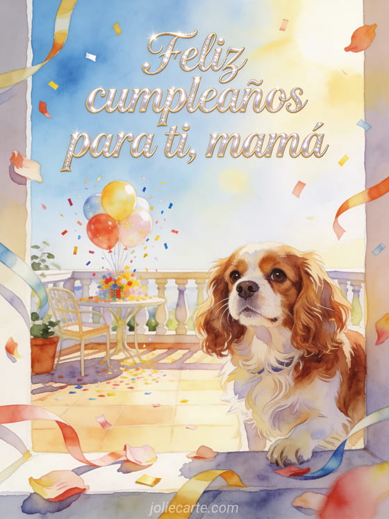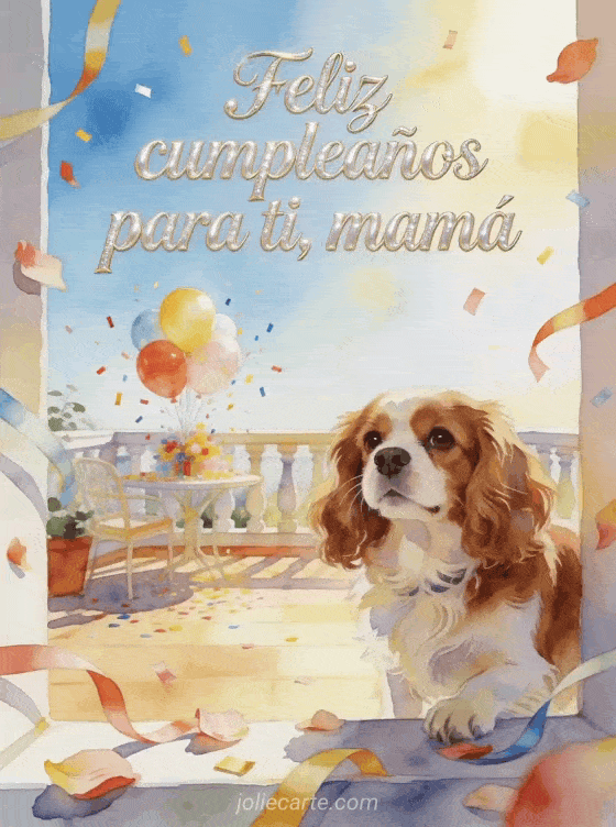Comparte un deseo alegre de cumpleaños para mamá con caligrafía perlada, un perro Cavalier King Charles, pétalos, serpentinas, globos y confeti en una terraza soleada. También pueden enviar un gif animado feliz cumpleaños mamá gif, un feliz cumpleaños suegra texto o una tarjeta feliz cumpleaños mamá gratis.
