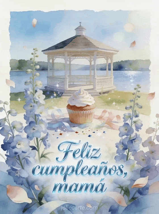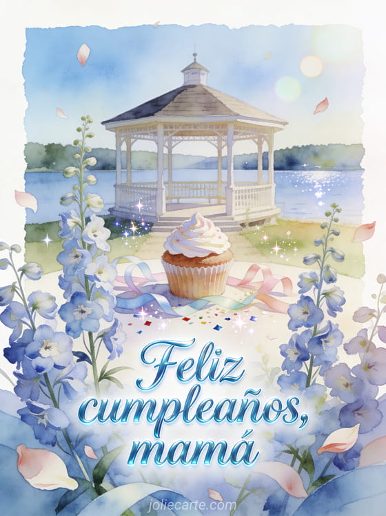 Comparte un deseo tranquilo de cumpleaños para mamá con caligrafía azul cielo, espuelas de caballero altas, un mirador junto al lago, un cupcake glaseado, cintas pastel y confeti brillante. También pueden enviar un cumpleaños mamá joven gif, una feliz cumpleaños mamá te quiero imagen o una imagen de cumpleaños para mamá.