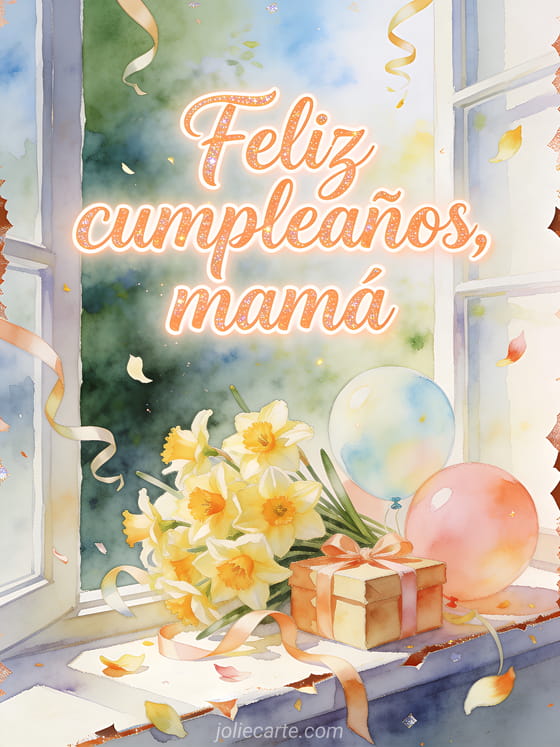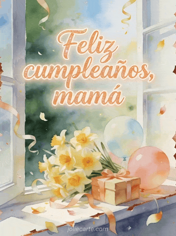 Comparte un deseo luminoso de cumpleaños para mamá con caligrafía durazno, brillo delicado, narcisos, cajas de regalo con lazos, globos pastel, pétalos y cintas rizadas en un alféizar iluminado. También pueden enviar un feliz cumpleaños mamá gif, una feliz cumpleaños mamá joven tarjeta o una feliz cumpleaños mamá imagen animada.