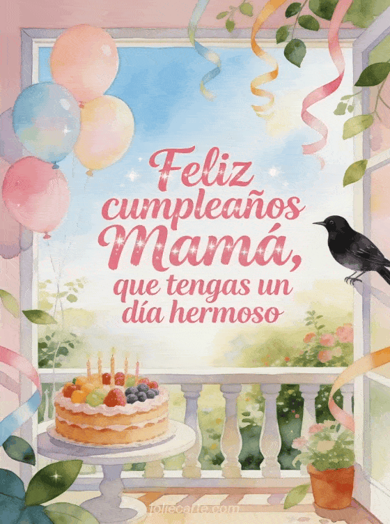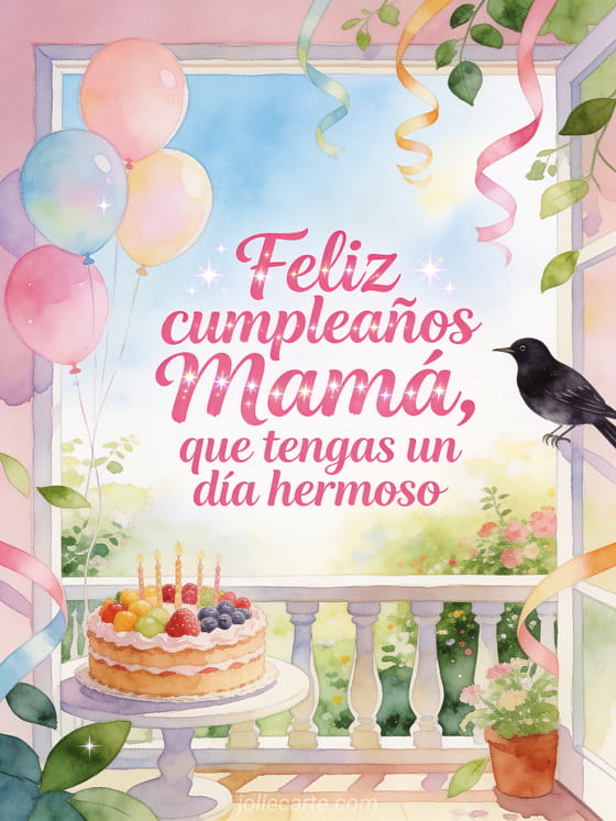 Comparte una imagen de feliz cumpleaños mamá joven con un mirlo cerca de globos pastel y una tarta de frutas de cumpleaños en un jardín luminoso de balcón. También pueden enviar feliz cumpleaños querida mamá gif, feliz cumpleaños mamá gifs o feliz cumpleaños mi mamita imagen.