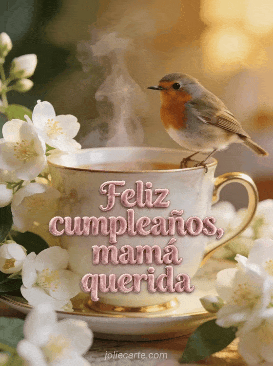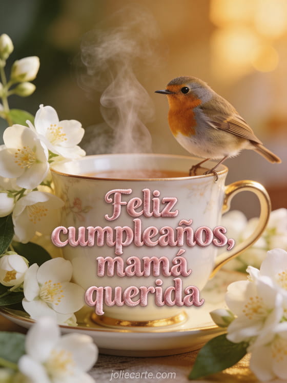 Comparte un saludo suave de cumpleaños para tu mamá querida con letras rosa empolvado, un petirrojo posado sobre una taza de té humeante, flores de jazmín y una atmósfera acogedora y cálida. También puedes enviar una tarjeta de feliz cumpleaños mamá te quiero, una tarjeta de tarjeta de cumpleaños mamá gratis o una tarjeta de feliz cumpleaños mi mamita.