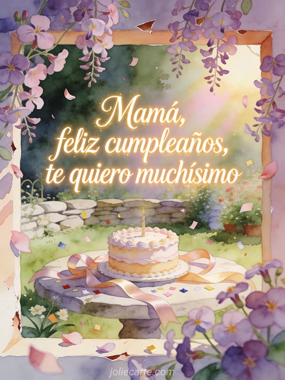 Dile a mamá cuánto la quieres con escritura rosa suave, brillo dorado, flores de aubrieta en cascada, un pastel glaseado, cintas de satén y una escena festiva en un jardín de piedra. También pueden enviar una imagen de cumpleaños para mamá, un feliz cumpleaños mamá gif animado o un gif animado feliz cumpleaños mamá gif.