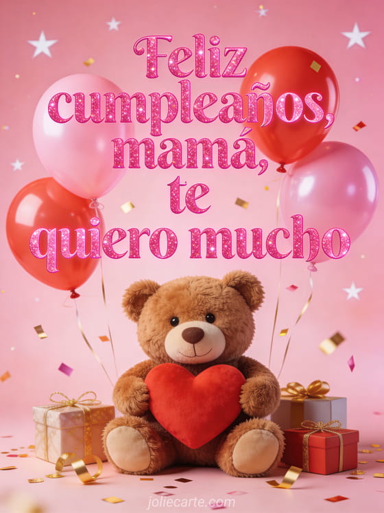 Dile a mamá que la quieres con una tarjeta cálida de cumpleaños con un osito de peluche marrón, un gran corazón rojo, globos rosas y rojos, confeti dorado, regalos pequeños y un brillo festivo rosado. También puedes enviar una tarjeta de tarjeta de cumpleaños mamá gratis, una tarjeta de feliz cumpleaños mi mamita o una tarjeta de feliz cumpleaños mamá dibujo.