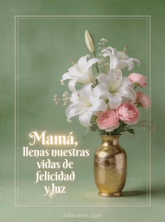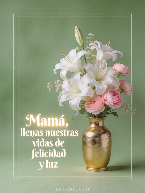 Envía un cariñoso mensaje de cumpleaños a tu mamá con esta elegante tarjeta de lirios blancos y ranúnculos rosados en un jarrón dorado sobre un suave fondo verde salvia. Descubre también tarjeta feliz cumpleaños mamá, mensaje cumpleaños mamá y tarjeta cumpleaños mamá.