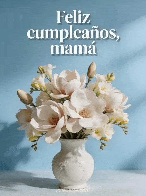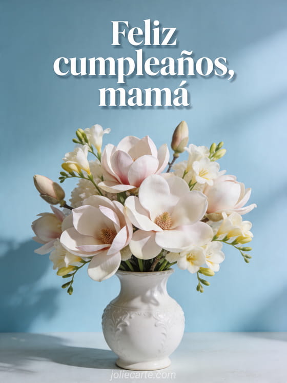 Comparte un cariñoso deseo de cumpleaños para tu mamá con esta suave tarjeta floral de magnolias y fresias en un jarrón blanco de porcelana. Descubre también texto cumpleaños mamá conmovedor, dibujo cumpleaños mamá y tarjeta conmovedora feliz cumpleaños mamá.