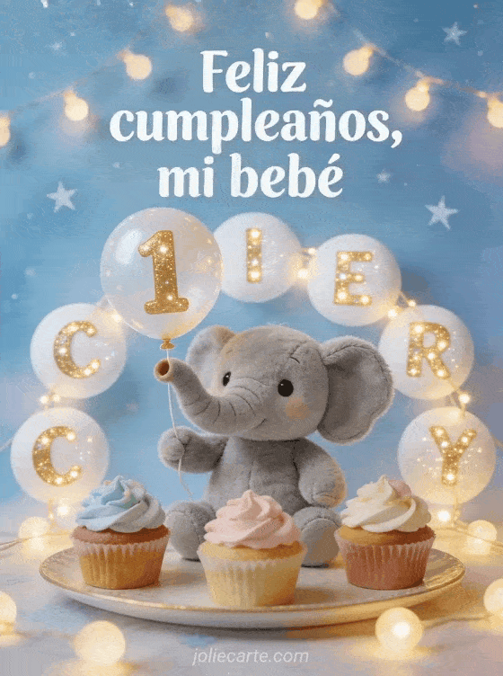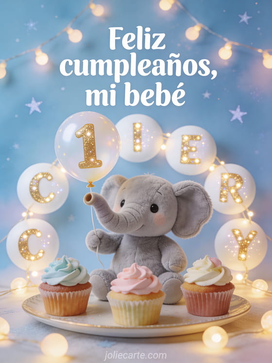Celebren el primer cumpleaños de su bebé con una ilustración suave y mágica de un elefante gris de peluche sosteniendo un globo con el número 1, cupcakes con crema colorida, guirnaldas de luces cálidas y un fondo azul pastel estrellado. Descubran también texto primer cumpleaños bebé, feliz cumpleaños mi pequeño bebé o feliz cumpleaños bebés animales.