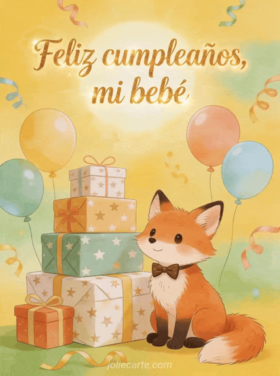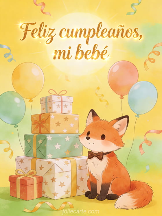 Deséenle a su bebé un cumpleaños luminoso con una ilustración juvenil y cálida de un zorrito rojo con moño junto a regalos envueltos con estrellas, globos redondos de colores, serpentinas flotantes y un fondo amarillo soleado. Descubran también feliz cumpleaños mi bebé de 1 año, texto primer cumpleaños bebé o feliz cumpleaños mi pequeño bebé.