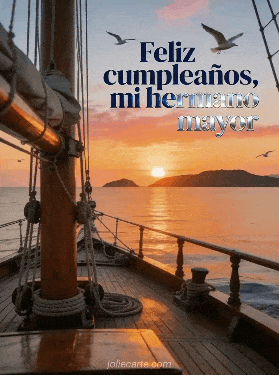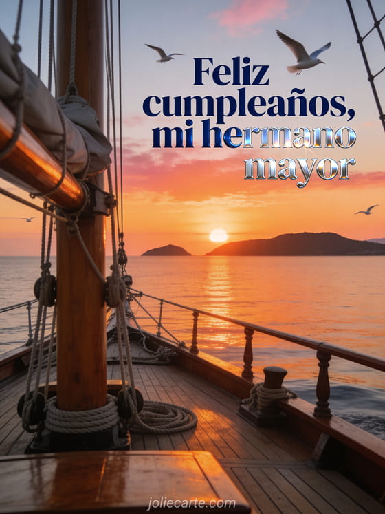 Desea feliz cumpleaños a tu hermano mayor con un atardecer marítimo realista, la cubierta de un barco de madera, mar tranquilo e islas en el horizonte. Descubre también una cumpleanos hermano.