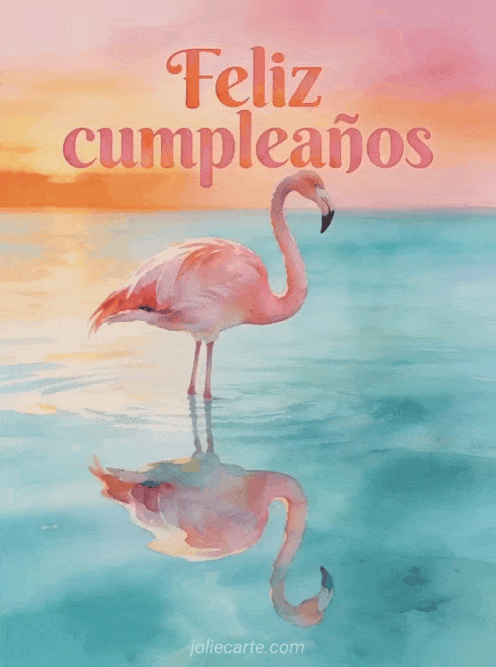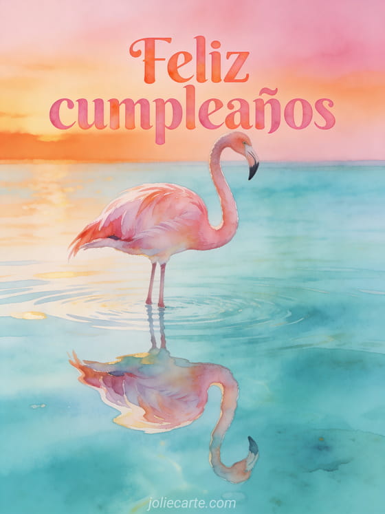 Comparte una tarjeta elegante y fotorrealista de cumpleaños con un flamenco rosado de pie en una laguna turquesa al atardecer, con su reflejo brillando en el agua. Descubre también un mensaje feliz cumpleaños hijo, una feliz cumpleaños feliz cumpleaños mi hijo o un sms para desear feliz cumpleaños a mi hijo.