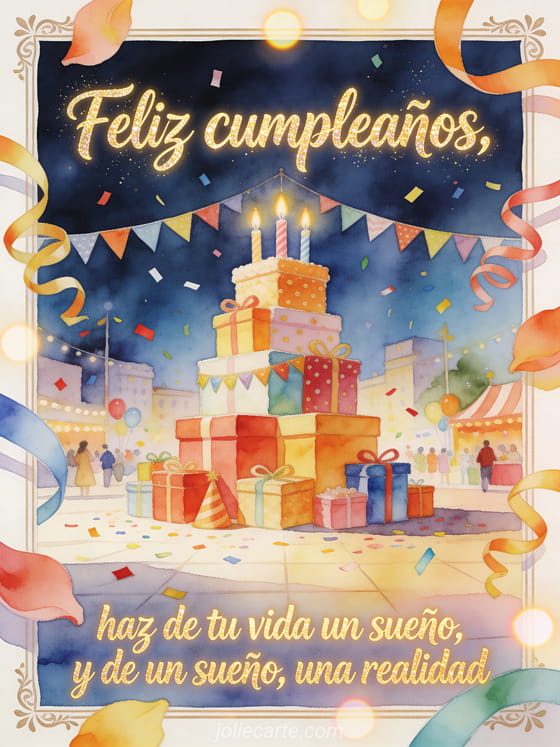 Envía una tarjeta de cumpleaños inspiradora con una celebración en acuarela alrededor de una alta torre de regalos, velas, guirnaldas y confeti flotante. El mensaje invita a tu hijo a hacer de su vida un sueño y de un sueño una realidad. Descubran también una cumpleaños para un hijo o una feliz cumpleaños mi niño grande.