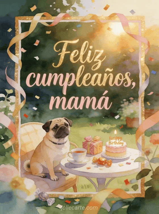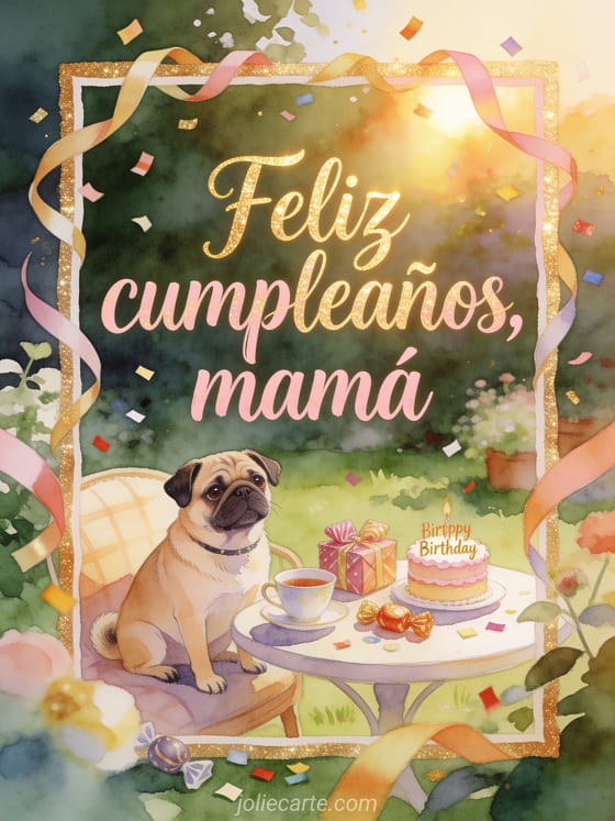 Comparte una imagen de feliz cumpleaños mi mamita con un perro pug junto a una taza, dulces envueltos y un pequeño pastel de cumpleaños sobre una mesa acogedora de jardín. También pueden enviar feliz cumpleaños mamá mensaje, feliz cumpleaños mamá te quiero o tarjeta de cumpleaños mamá gratis.