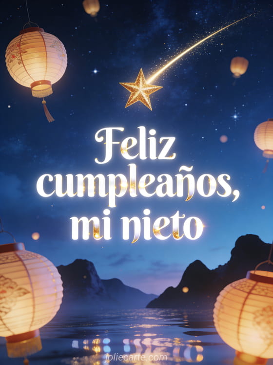 Envíen un saludo de cumpleaños de ensueño a su nieto con un cielo estrellado azul profundo, una estrella fugaz dorada, linternas luminosas y siluetas de montañas. Descubran también risa sin alegría, mensaje cumpleaños nieto o feliz cumpleaños mi nieto.