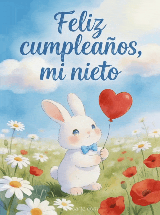 Envíen un saludo tierno de cumpleaños a su nieto con un conejo blanco que sostiene un globo rojo en forma de corazón en una pradera de margaritas y amapolas. Descubran también feliz cumpleaños mi nieto, desear feliz cumpleaños a tu nieto o desear feliz cumpleaños a mi nieto.