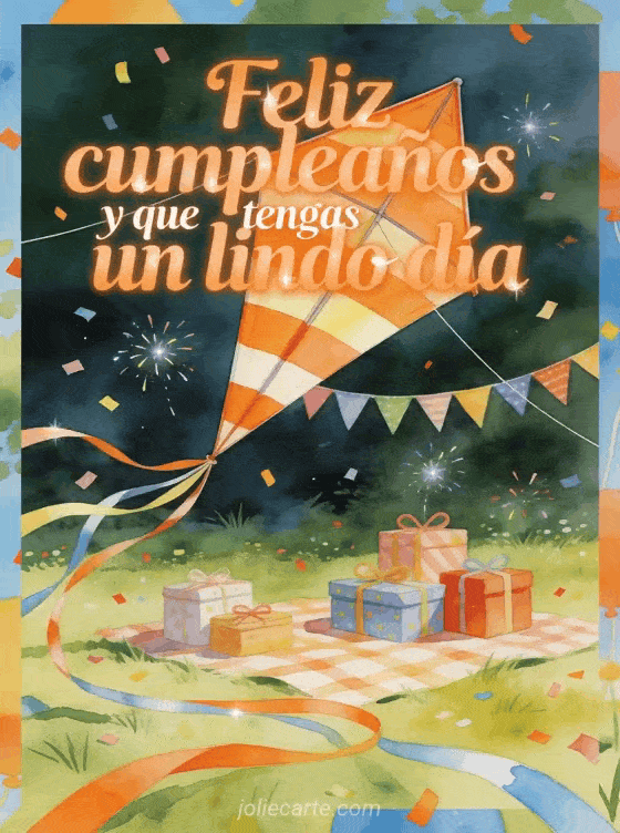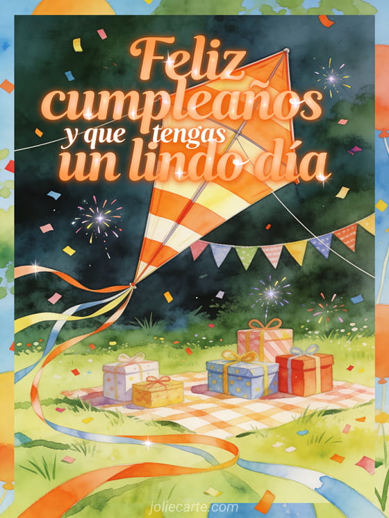 Envía un saludo de cumpleaños lleno de color con una escena en acuarela alegre y luminosa. Una cometa gigante se eleva sobre un picnic en la pradera con regalos, banderines y confeti brillante para desearle un día muy lindo.