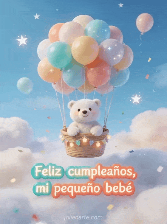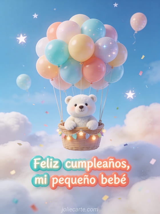 Celebren a un pequeño bebé con una tarjeta de cumpleaños de ensueño que muestra un oso polar de peluche sentado en una cesta de globo aerostático, rodeado de globos redondos de colores, nubes suaves, estrellas brillantes y confeti ligero. Descubran también feliz cumpleaños bebés animales, texto cumpleaños bebé niño 1 año o bebé desea feliz cumpleaños.