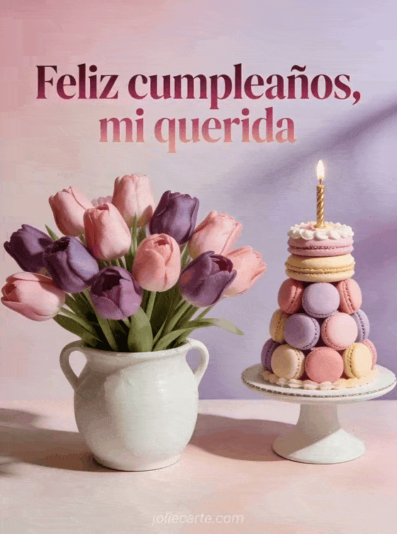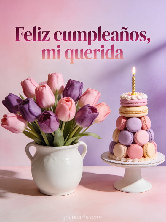 Envía un saludo de cumpleaños tierno y romántico con un bouquet fotorrealista de tulipanes rosados y violetas en una maceta de cerámica blanca. Una torre de macarons pastel con vela dorada funciona como pastel de cumpleaños en una escena suave y elegante. Descubran también feliz cumpleaños mi querida, cumpleaños romántico o feliz cumpleaños mi amor gif.