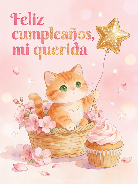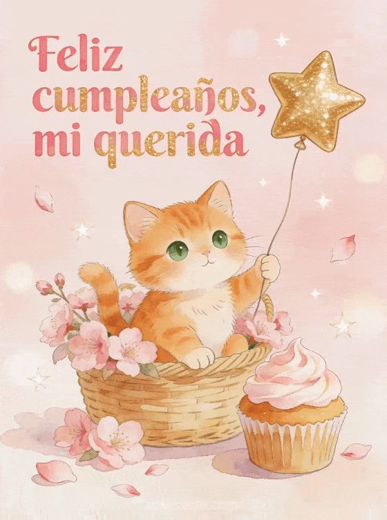 Envía un saludo de cumpleaños tierno con un adorable gatito naranja que sostiene un globo de estrella dorada sentado en una canasta de flores de sakura rosadas. Un pequeño cupcake rosado, pétalos y estrellas brillantes crean una escena delicada y festiva. Descubran también cumpleaños romántico, feliz cumpleaños mi amor gif o feliz cumpleaños mi amor hombre gif animado.