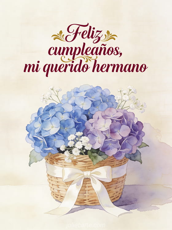 Envía a tu querido hermano una tarjeta refinada de cumpleaños en acuarela con hortensias azules y malvas en una canasta tejida, paniculata blanca y una cinta de satén marfil. También pueden compartir una cumpleaños hermano gif, una cita cumpleaños hermano o una mi hermano feliz cumpleaños hermano humor.