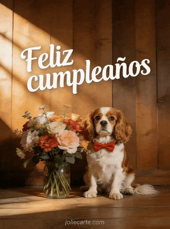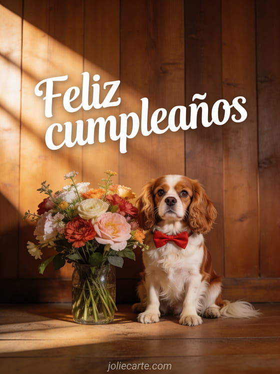 Envía esta encantadora tarjeta de cumpleaños con un adorable perro Cavalier King Charles con pajarita roja junto a un ramo de flores bajo una cálida luz de bosque. Una tarjeta fotorrealista que enamora. Descubre también tarjeta de cumpleaños para mujer con naturaleza o texto de feliz cumpleaños para mujer.