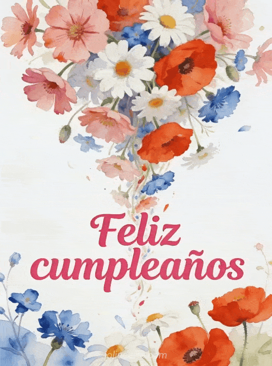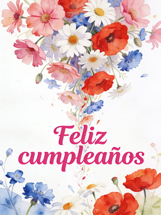 Celebra con una tarjeta de cumpleaños vibrante donde cosmos, margaritas y amapolas caen en una lluvia floral festiva. También puedes ver tarjeta cumpleaños mujer champán, fotos feliz cumpleaños mujer y cumpleaños mujer gratis.
