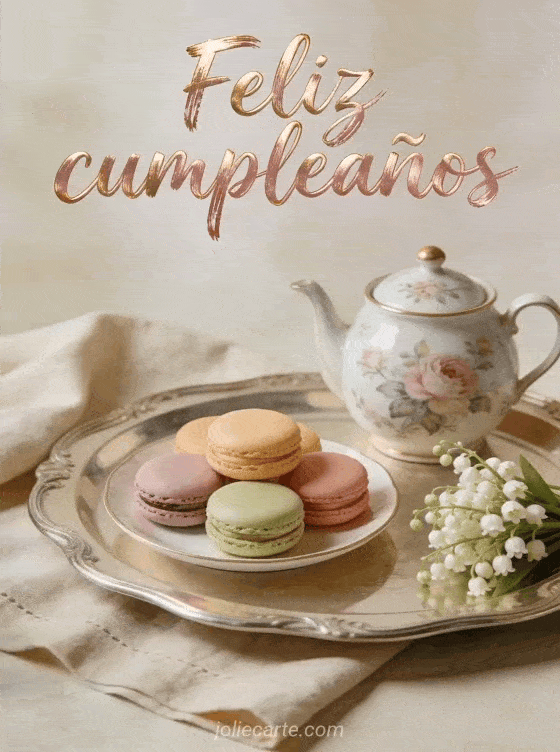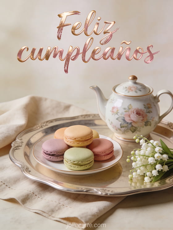 Compartan esta tarjeta fotorrealista con macarons coloridos, tetera floral y lirio de los valles para una celebración refinada. También pueden ver dromedario tarjeta cumpleaños mujer, amiga cumpleaños mujer amiga y gif feliz cumpleaños mujer humor.