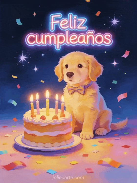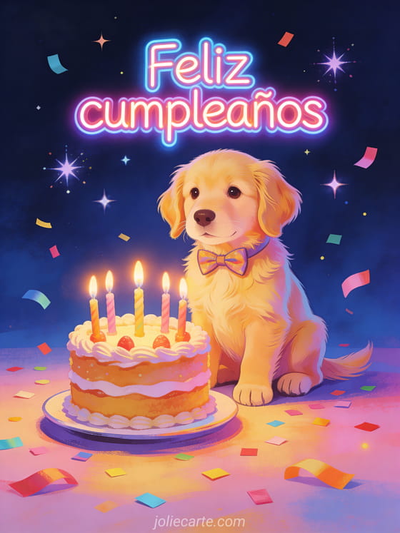 Comparte una tarjeta alegre de cumpleaños con un adorable golden retriever usando moño, sentado frente a un pastel con velas encendidas, confeti y estrellas brillantes sobre fondo azul noche. Descubre también una feliz cumpleaños mi hijo amado, un mensaje feliz cumpleaños hijo o una feliz cumpleaños feliz cumpleaños mi hijo.