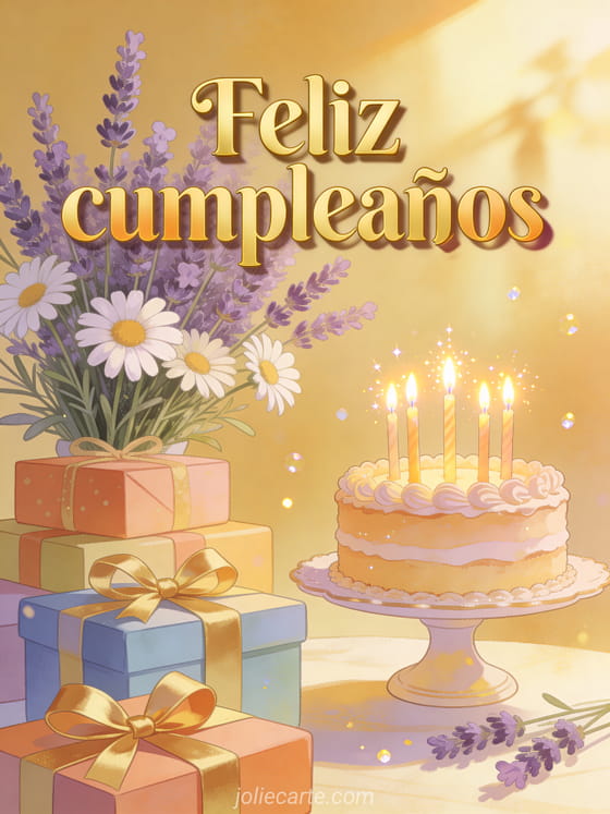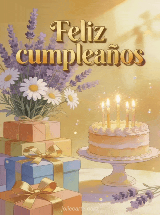 EnvĆa una tarjeta de feliz cumpleaƱos padrastro con letras doradas clĆ”sicas, lavanda y margaritas sobre un fondo dorado cĆ”lido, regalos coloridos, velas encendidas y un pastel elegante. Descubre tambiĆ©n papĆ” te deseo un feliz cumpleaƱos, una tarjeta de feliz cumpleaƱos papĆ” o feliz cumpleaƱos papĆ” imĆ”genes animadas.