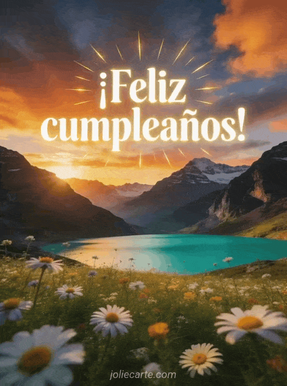 Envía un impresionante feliz cumpleaños con un espectacular paisaje de montaña y lago. Letras blancas luminosas con rayos dorados brillan sobre un cielo de atardecer espectacular. Descubre también un gif feliz cumpleaños tierno o un feliz cumpleaños con ternura.