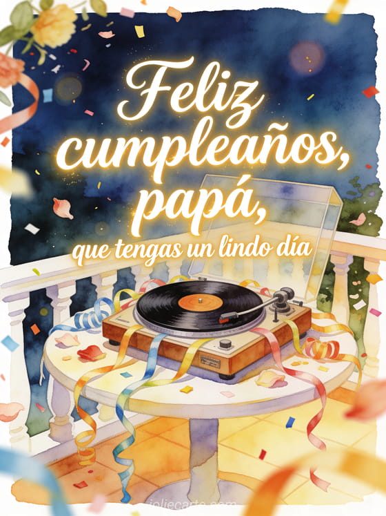 Comparte feliz cumpleaños papá en caligrafía con una mesa de terraza en acuarela, un tocadiscos girando y serpentinas festivas de cumpleaños. También pueden enviar te quiero feliz cumpleaños papá, tu hija feliz cumpleaños papá de tu hija o carta para el cumpleaños de papá.