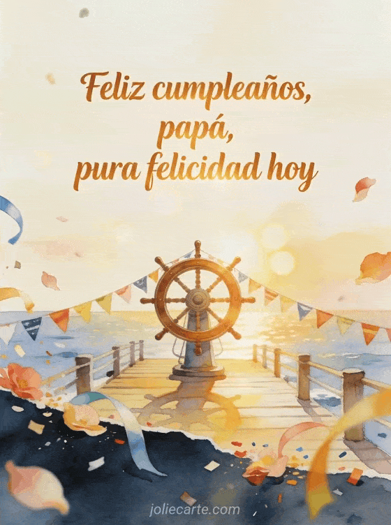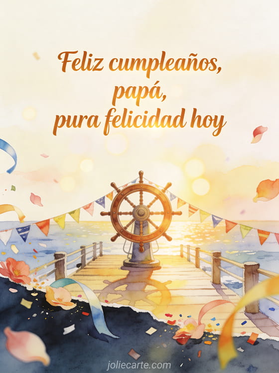Comparte feliz cumpleaños papá simple con una rueda de barco rodeada de banderines de cumpleaños sobre un muelle soleado, en una luz marina de acuarela. También pueden enviar feliz cumpleaños papá corazón, feliz cumpleaños papá auto o feliz cumpleaños papá caligrafía.