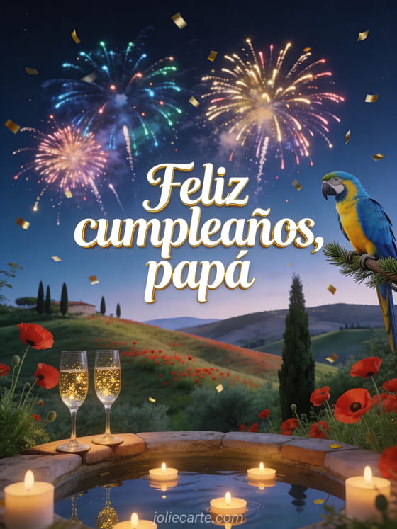 Envía una tarjeta de feliz cumpleaños papá con letras elegantes blancas y doradas, colinas de Toscana con amapolas y cipreses, fuegos artificiales, un guacamayo, velas flotantes y copas de champán. Descubre también una carta de cumpleaños para su papá, una feliz cumpleaños padrastro tarjeta o papá te deseo un feliz cumpleaños.