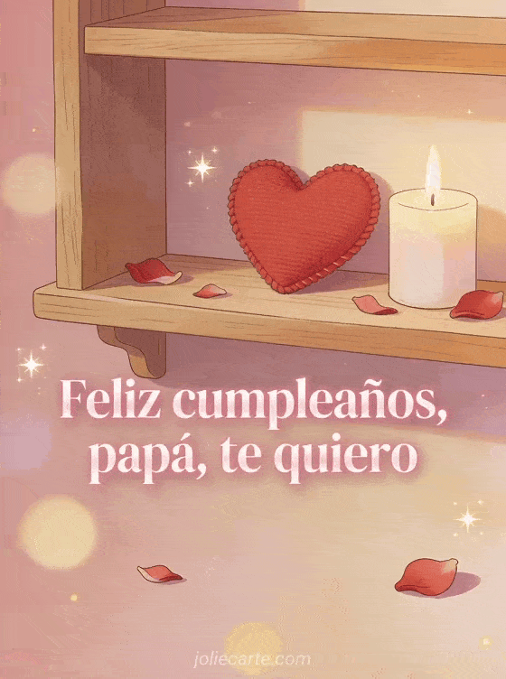 Envía un feliz cumpleaños papá te quiero gif con letras rosa suave luminosas, un pequeño corazón rojo de tela sobre una repisa de madera, una vela encendida, pétalos de rosa y luz tenue cálida. Descubre también una feliz cumpleaños papá tarjeta de cumpleaños, una carta de cumpleaños para su papá o una feliz cumpleaños padrastro tarjeta.