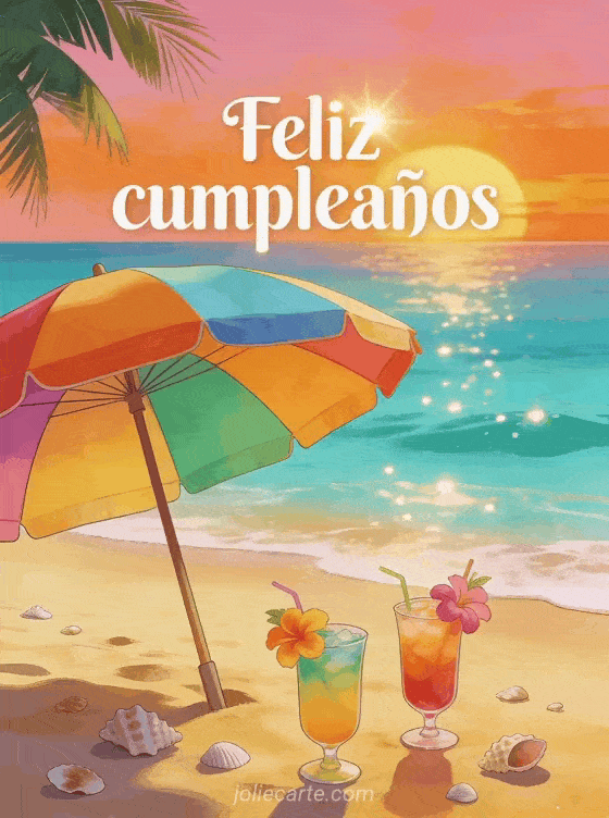 Compartan un mensaje de cumpleaños alegre con esta tarjeta tropical de playa, llena de luz y ambiente vacacional. También pueden enviar feliz cumpleaños lleno de felicidad, te deseamos un feliz cumpleaños o feliz cumpleaños gato.