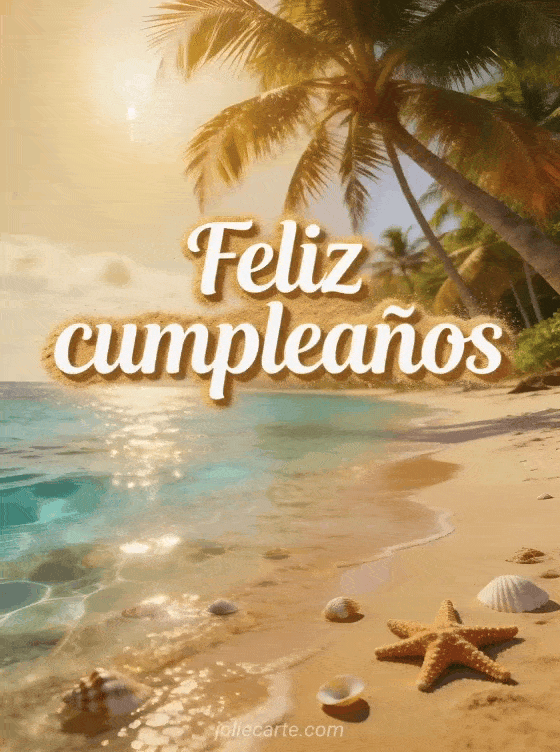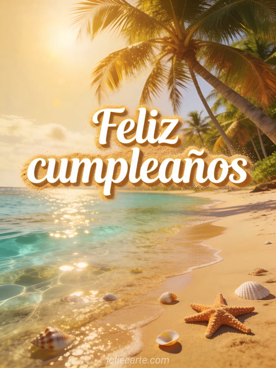 Celebra con una tarjeta de feliz cumpleaños playa con agua cristalina, arena fina, palmeras y conchas bajo luz dorada. Descubre también feliz cumpleaños tranquilo, feliz cumpleaños flores naturaleza y feliz cumpleaños dibujo color.