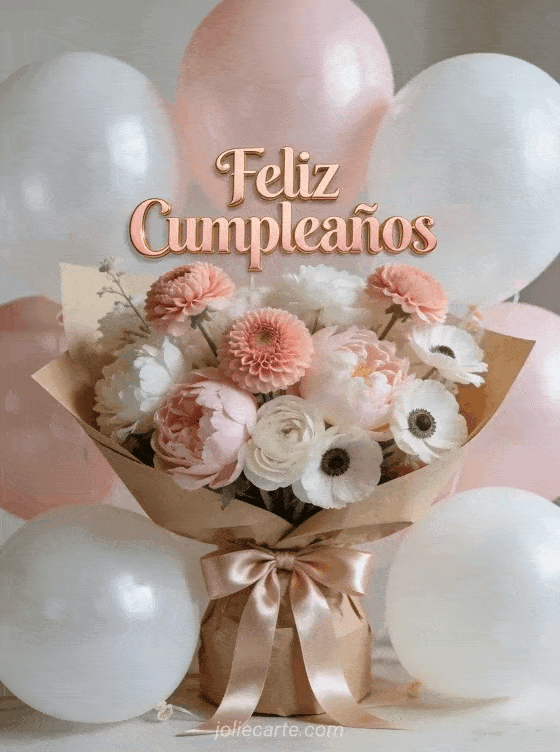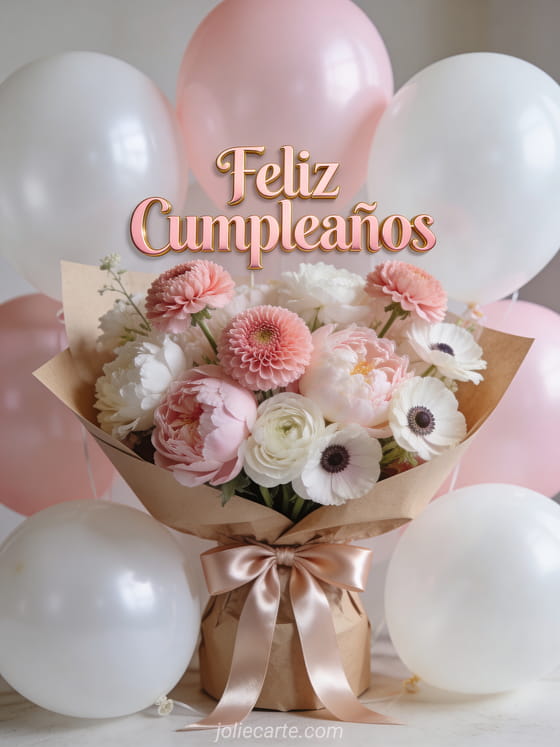 Celebra su cumpleaños con un lujoso ramo de ranúnculos rosas, peonías blancas y anémonas envueltas en papel kraft con lazo de satín, rodeado de globos rosas y blancos. Descubre también una cumpleaños mujer flores o una tarjeta cumpleaños mujer acuarela.