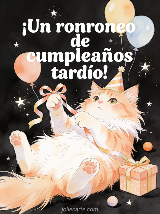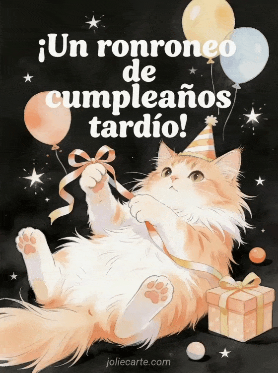 Discúlpate por olvidar un cumpleaños con esta adorable tarjeta de feliz cumpleaños tarde con gato llena de ternura. Descubre también un gif feliz cumpleaños con retraso, un texto feliz cumpleaños con retraso o una tarjeta cumpleaños hombre con retraso.