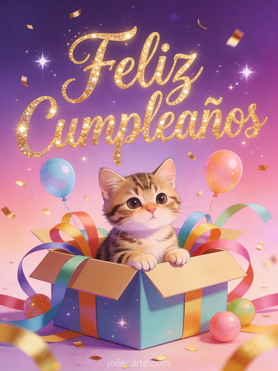 Envía un adorable feliz cumpleaños con esta linda tarjeta con un gatito atigrado en una caja de regalo rodeado de globos y cintas. Descubre también una tarjeta cumpleaños con gato naranja o una tarjeta cumpleaños fuegos artificiales o una tarjeta cumpleaños paisaje de montañas.