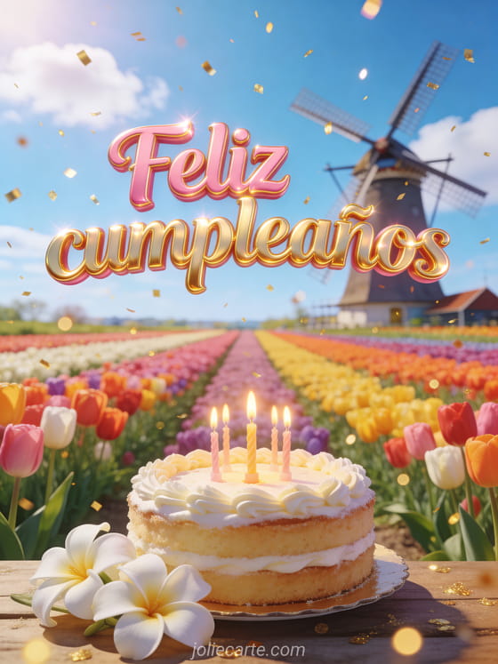 Celebra un cumpleaños especial con esta colorida tarjeta que muestra campos interminables de tulipanes, flores de tiaré, un pastel decorado con velas encendidas y lluvia de brillos dorados. Descubre también una tarjeta de feliz cumpleaños o una imagen gratis de feliz cumpleaños.