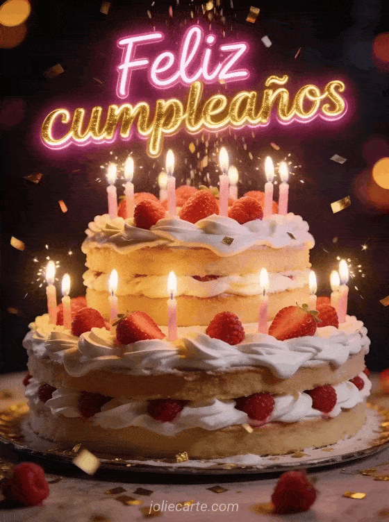 Comparte esta tarjeta festiva con letras neón y un hermoso pastel lleno de velas. Descubre también una imagen feliz cumpleaños o una tarjeta palabras de feliz cumpleaños.