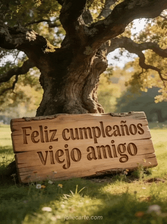 Celebra a un viejo amigo con una tarjeta de cumpleaños con un roble majestuoso en pradera verde y luz dorada entre las hojas. Descubre también desear un feliz cumpleaños, tarjeta feliz cumpleaños gif y mensaje feliz cumpleaños.