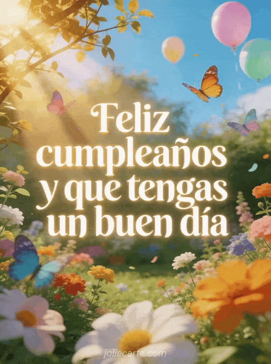Envía esta tarjeta de feliz cumpleaños deseando un buen día — un jardín matutino soleado con rayos dorados entre las ramas, mariposas coloridas y globos pastel en el cielo azul. Descubre también feliz cumpleaños brillante o imagen gratuita de feliz cumpleaños con gato.