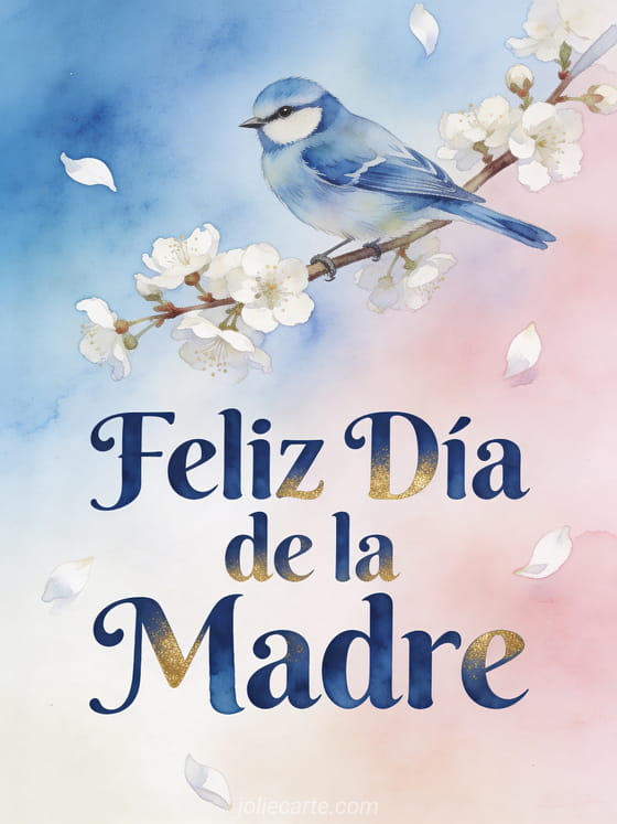 Celebra el Día de la Madre con esta encantadora tarjeta de felicitación gratuita. Una delicada ilustración acuarela muestra un herrerillo posado sobre una rama de espino en flor, con pétalos que danzan al viento. Descubre también una tarjeta con imágenes para el Día de la Madre, una tarjeta floral para mamá o una tarjeta con palabras dulces para mamá.