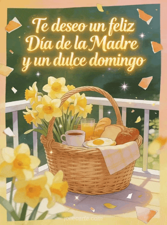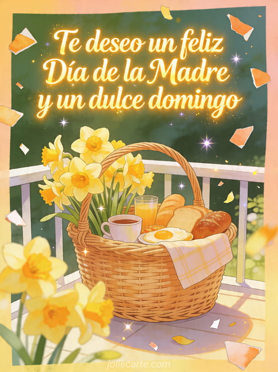 Compartan un mensaje luminoso para el Día de la Madre y un dulce domingo, con una cesta de desayuno, narcisos radiantes y un balcón de primavera. Descubran también una cita para el Día de las Madres, imágenes gratis Día de las Madres o imágenes para el Día de la Madre.