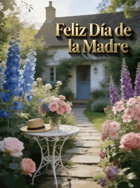 Comparte una tarjeta luminosa de feliz Día de la Madre con letras doradas, flores de cottage y una suave luz de tarde. Descubre también una tarjeta de feliz Día de las Madres mamá querida, un deseo día de la madre a mi hija o una tarjeta día de la madre caja de palabras dulces.