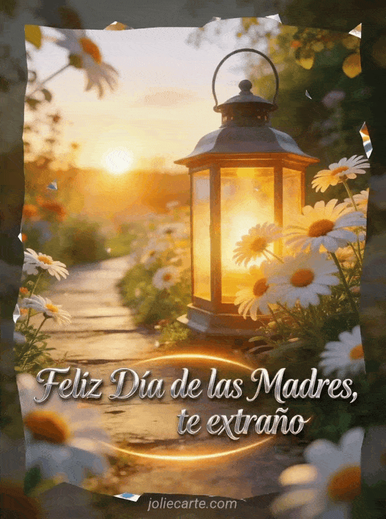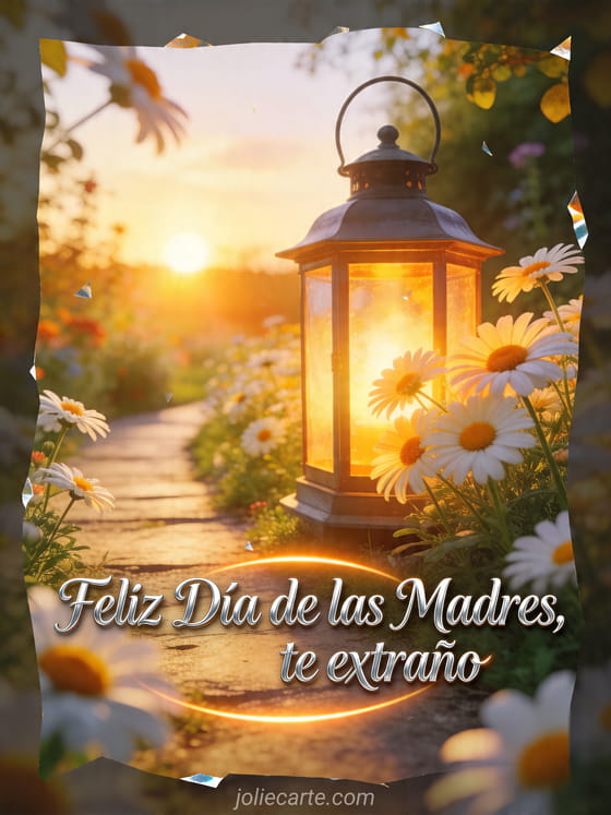 Comparte Feliz Día de las Madres mamá fallecida con caligrafía plateada, halo cálido y una linterna luminosa fotorrealista rodeada de margaritas en un sendero de jardín al amanecer. Esta tarjeta relajante dice te extraño con ternura. Descubre también feliz Día de la Madre y feliz domingo, cita para el Día de las Madres o imágenes gratis Día de las Madres.